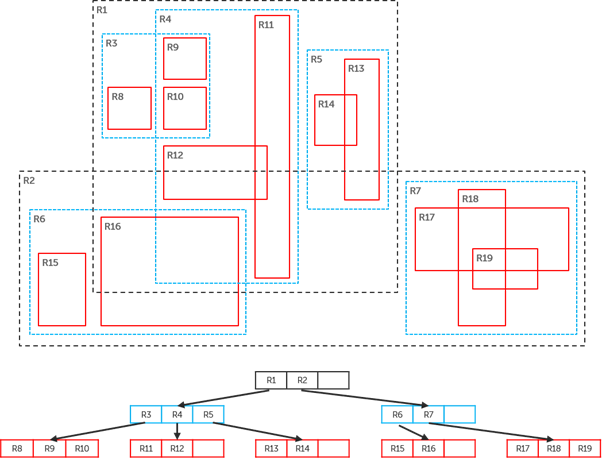 The nature of geospatial data does not allow it to be stored in a standard pandas DataFrame (a typical format for data in Python). For this data, OceanMind needed a new way of storing data that could be updated frequently and cost-efficiently. For this task, OceanMind uses a special form of R-Trees. The idea of an R-tree, first proposed by Antonin Guttman in 1984, is to group nearby objects and represent them with their minimum bounding rectangle (Figure 2). Overlapping boxes thus represent segments of the vessel tracks which were near one another, forming candidates for the proximity analysis. To ensure efficiency with continuous updates, OceanMind uses the R-Tree with Update Memos (RUM tree) which reduces the cost of object updates [5].