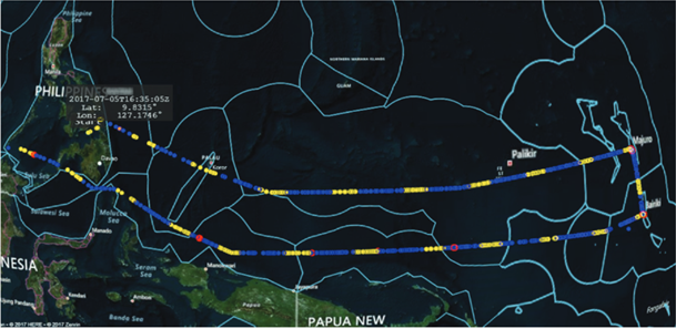 Using Azure, OceanMind can locate ships that have been in contact for a certain amount of time. This is done through geospatial processing of data from each ship’s Automatic Identification System (AIS). Larger vessels are legally required to carry an AIS for safety reasons [4]. Each signal transmitted by the AIS contains an identification code which specifies the purpose of the ship. If a ship attempts to manipulate the information transmitted by the system, movement tracking alone can still pick out rogue vessels. For example, if the signal and vessel tracks imply the vessel is a cargo ship, but the vessel is travelling in circles or a slow speed which is typical for fishing rather than transit, such suspicious behaviour would be flagged by the AI system (which is trained on normal behaviour) for investigation by the analysts.